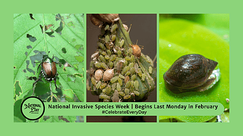 National Invasive Species Awareness Week begins the last Monday of February. The week is organized to bring attention to the impacts, prevention, and management of invasive species - and all those who are working toward healthy, biodiverse ecosystems. It highlights risks posed by invasive species that can threaten the economy, environment, and public health. You may see events around the world to help people identify invasive species issues and possible solutions.