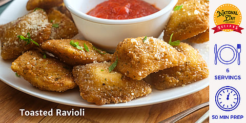Coat ravioli thoroughly in egg mixture and allow excess to drip off. Then, dredge in the breadcrumbs and completely cover.